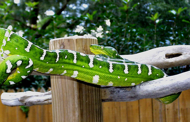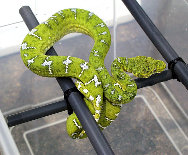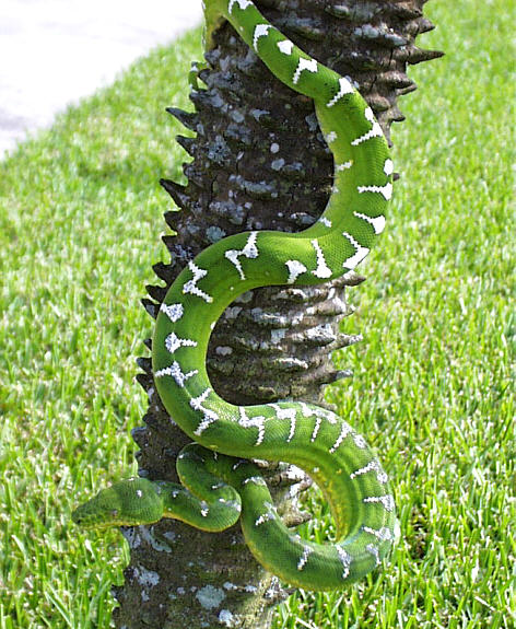 .....I received a phone call from a friend of mine one day who is always on the lookout for different animals. He is also an Emerald enthusiast like myself. He informed me that he had found 2 completely unique looking animals out of a large shipment of Emeralds destined for Japan. He managed to secure the animals and I received them a short time later. They were 2 females. The one larger female you see here and a slightly smaller animal not presented on this page. They were set up in quarantine and the smaller animal accepted food right away. However, after only a couple of days the tell tale signs of problems were visible. Bloating and a series of regurgitation followed; not unlike many peoples experiences with imported Emeralds. |