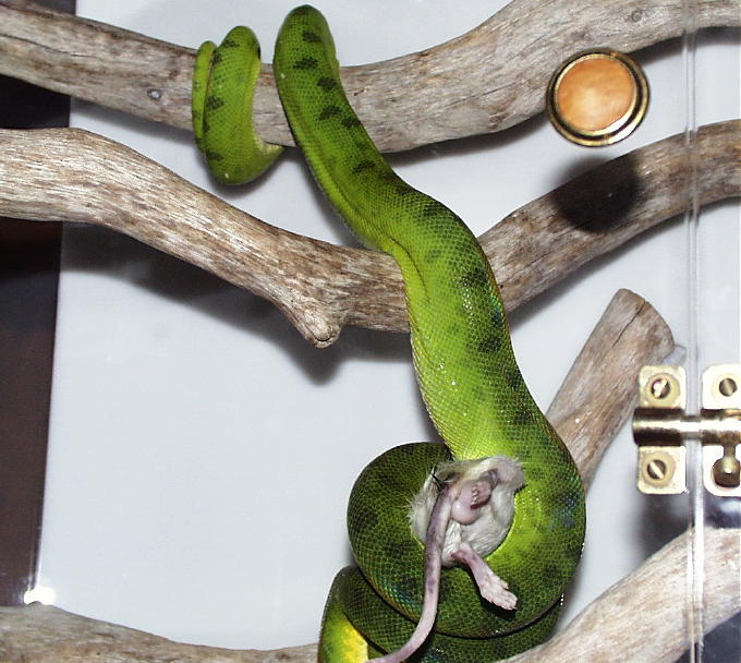 Found him.. The perfect male to go with my females. This is THE best "anaconda phase" patternless I've seen. He is a uniform green all the way up to the back of the head with perfect frosted black polka dots all the up as well. Keeping my fingers crossed he will be a good breeder. Hoping for babies in the Fall of 2004. |